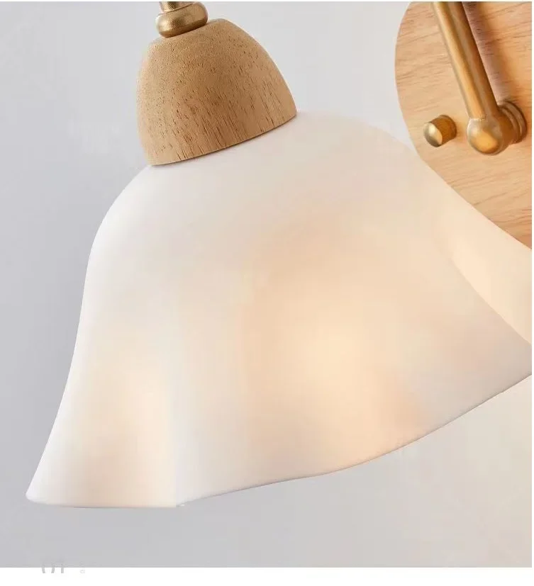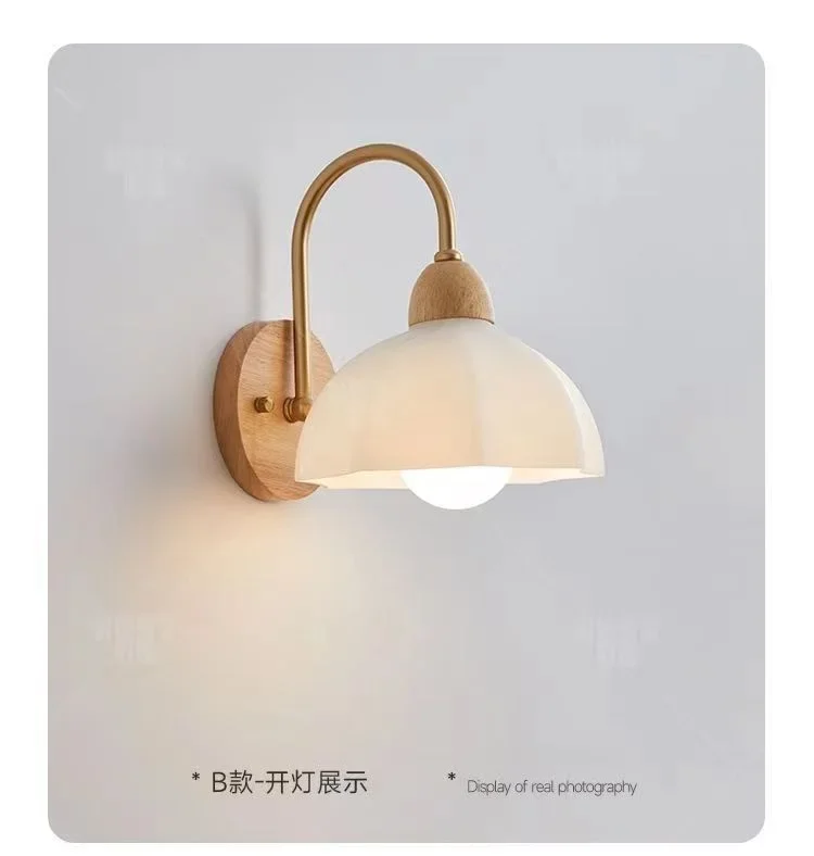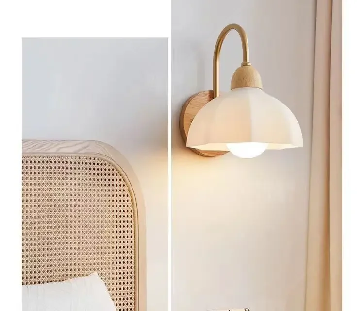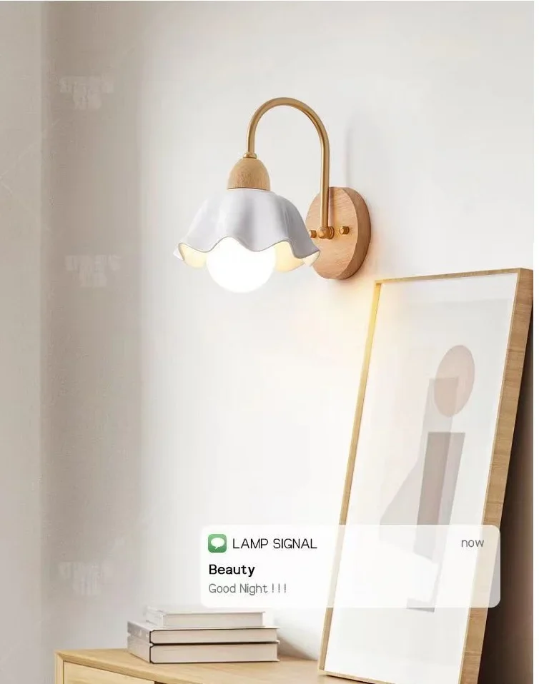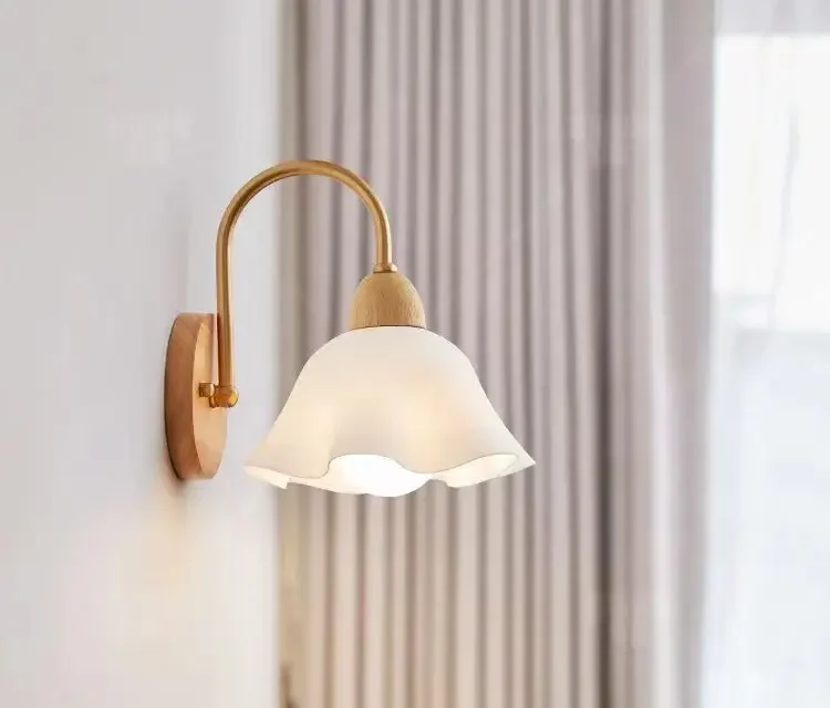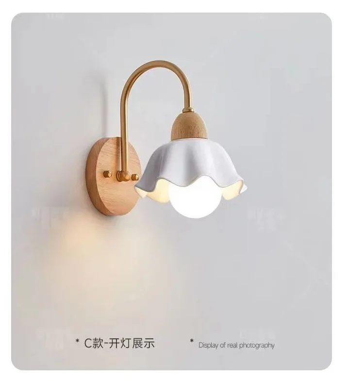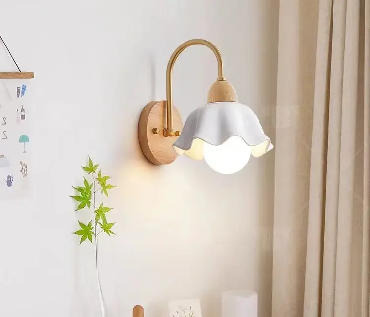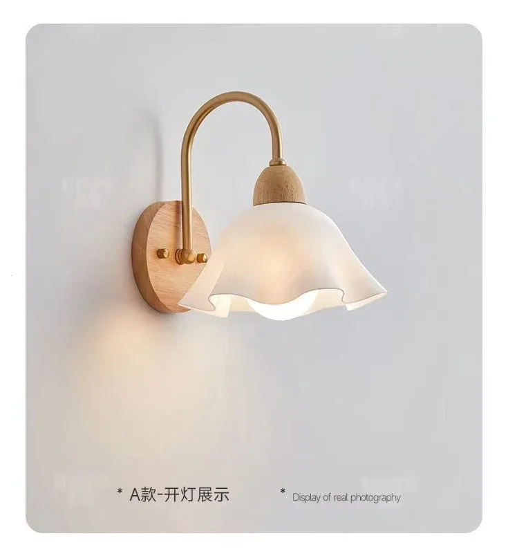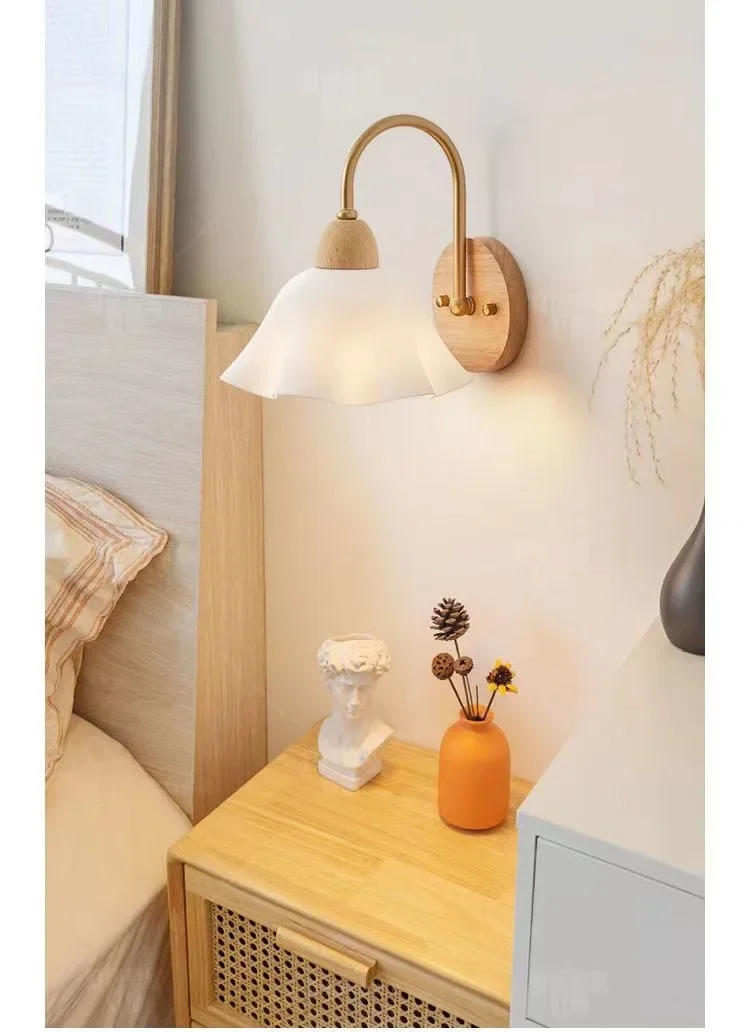 Japanese Style Wooden Wall Lamp, Pastoral Floral INS Sconce Light for Bedroom Be