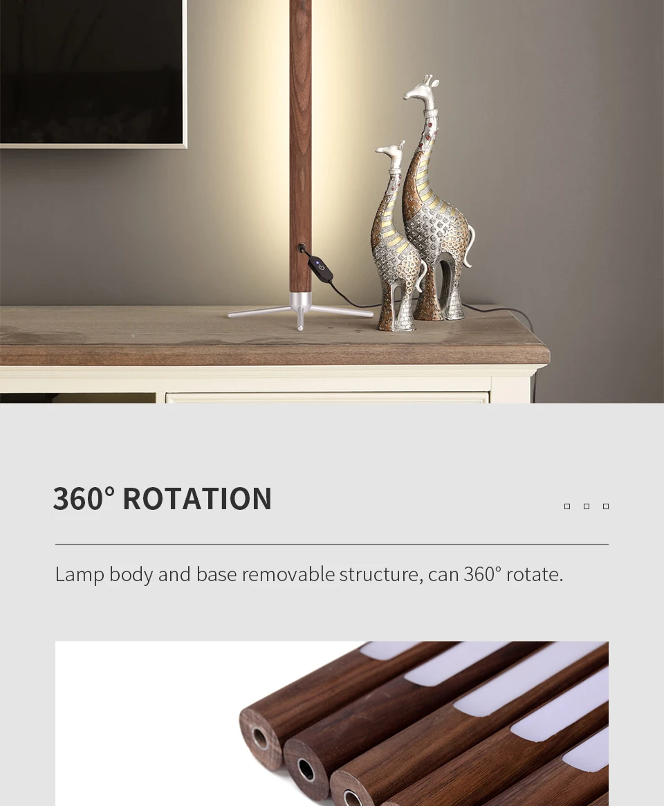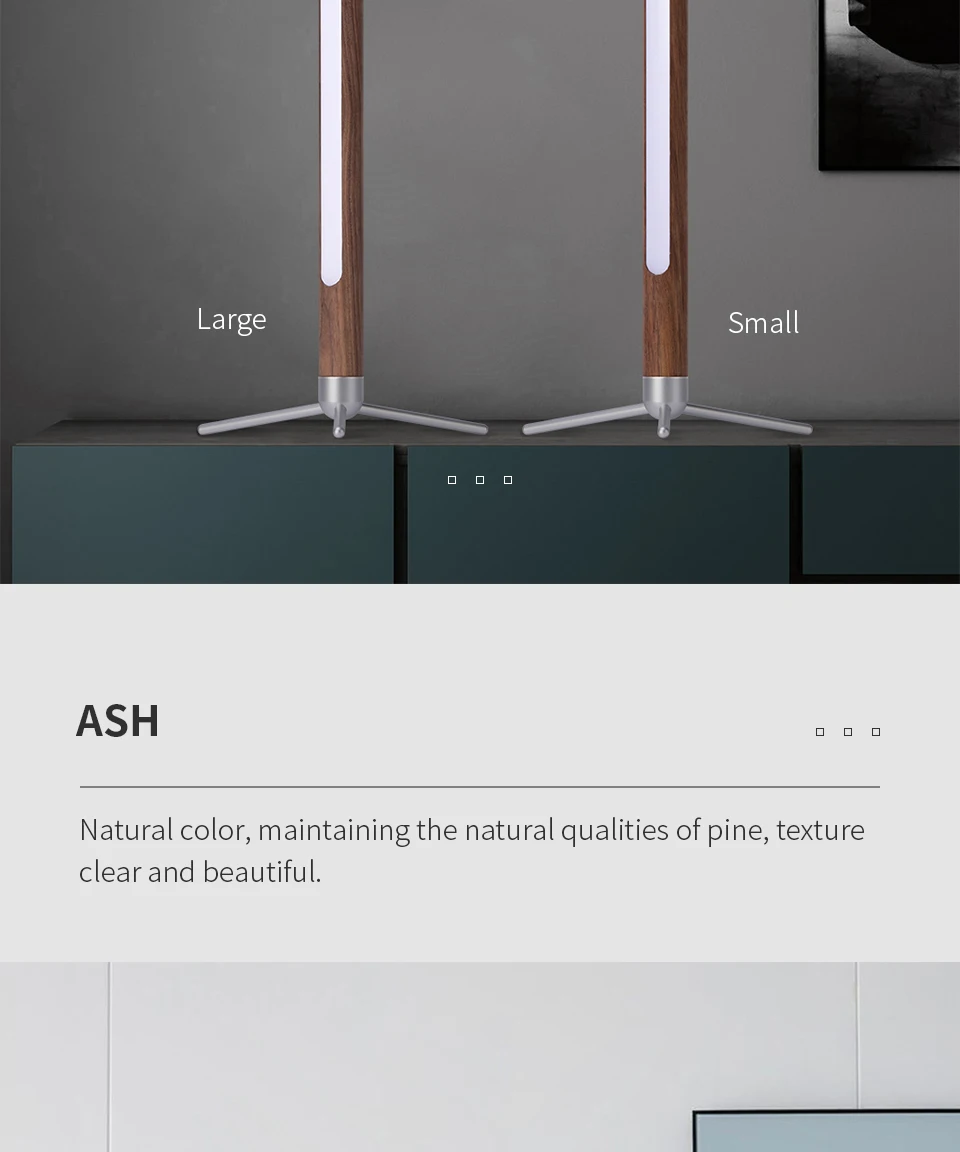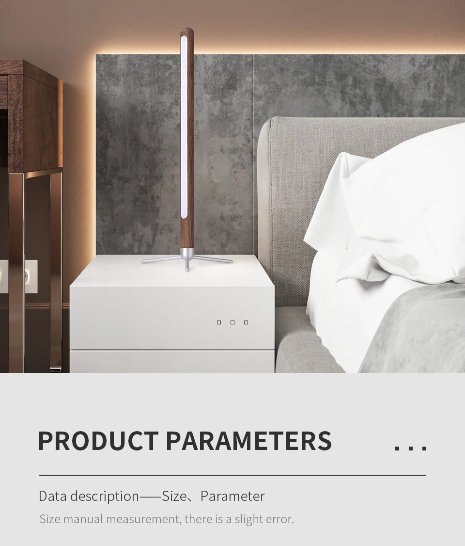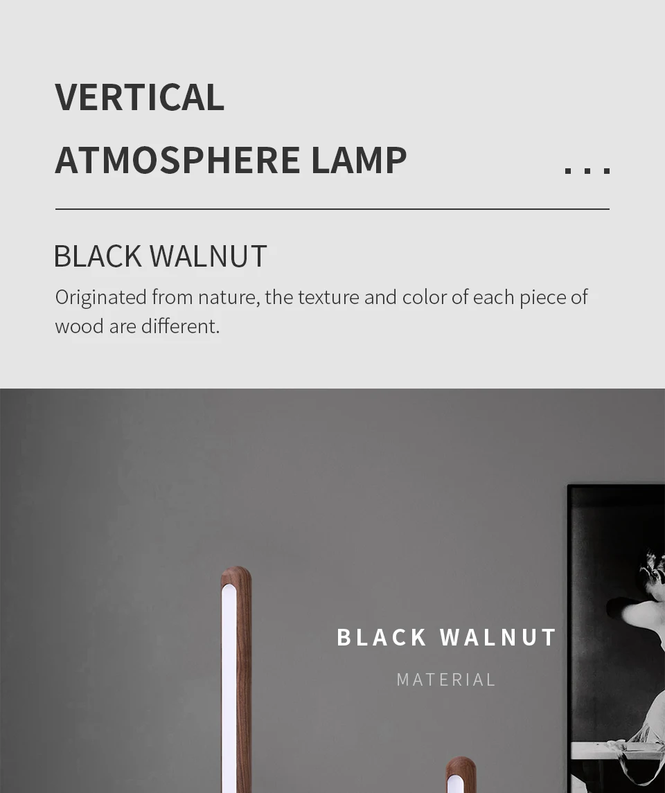 If you need the long fixture in the video please contact us, thank you.Features:【Solid Wood Materials】: This Wooden Table Lamp is made of black walnut and natural ash, can be used as your desk or nightstand. The sturdy aluminum base ensures lamp durability and stability, while the wood grain pattern adds elegant beauty.【ECO-Friendly Energy-Saving LEDS】: This LED Wooden Table Lamps is equipped with energy-saving LEDs for long-lasting performance without sacrificing quality. It uses less energy and allows you to enjoy bright, flicker-free light, making it an eco-friendly choice for your home.【Vertical Lighting Atmosphere】: Unlike traditional lamps, our vertical design provides light in any room. Vertical light from above and below provides a soothing ambiance, allowing you to relax at night and enjoy the moment.【Adjustable Warm Light】: This Minimalist LED Desk Light light outputs a warm light that creates a cozy atmosphere ideal for relaxing or reading. The adjustable brightness allows you to customize the lighting to suit your needs and mood, ensuring comfort and visual harmony.【360° Rotation Flexibility】: Our Vertical Atmosphere Lamp can rotate 360° so you can control the direction of the light any way you want. Whether you need focused task lighting or diffused ambient light, simply adjust the angle.Product Specifications:Product Name: LED Wooden Table LampsProduct Dimensions: Small/LargePower: 4W/8WNet weight: 0.3Kg/0.4KgMaterial: Ash /Black walnut wood and aluminum alloyVoltage: 12VLight source type: LEDColor temperature: 3500 Kelvin Warm LightPackage Included:1* LED Wooden Table Lamp1* Stabilizer Blade1* Round Head of Base1* Switch Wire1* 12V1A/2A Power Supply